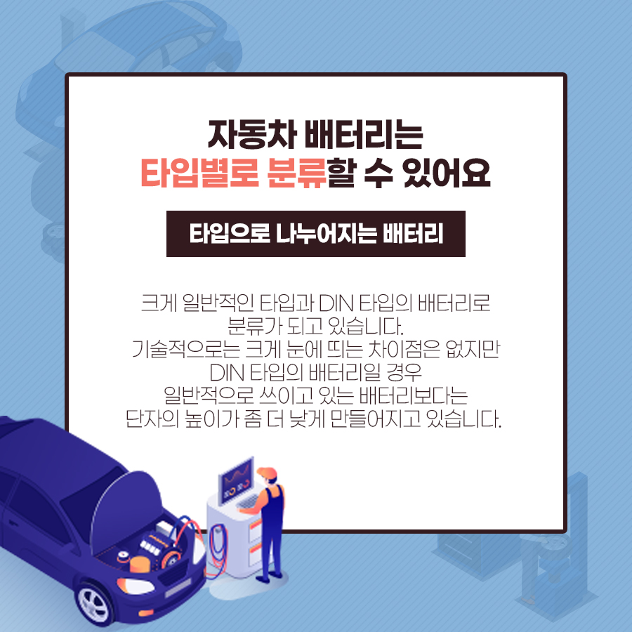 자동차 배터리는 타입별로 분류됩니다.